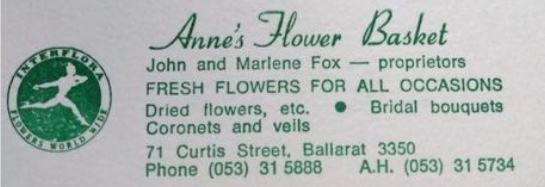 Marlene Barbara Fox and her husband John purchased Anne's Flower Basket Florist in 1977. It was originally located at 71 Curtis Street but in 1981 relocated to 42-44 Main Road, Ballarat.